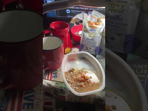 MAMA CAT & KITTEN KAT TRY FANCY FEAST BROTHS FIRST TRY.